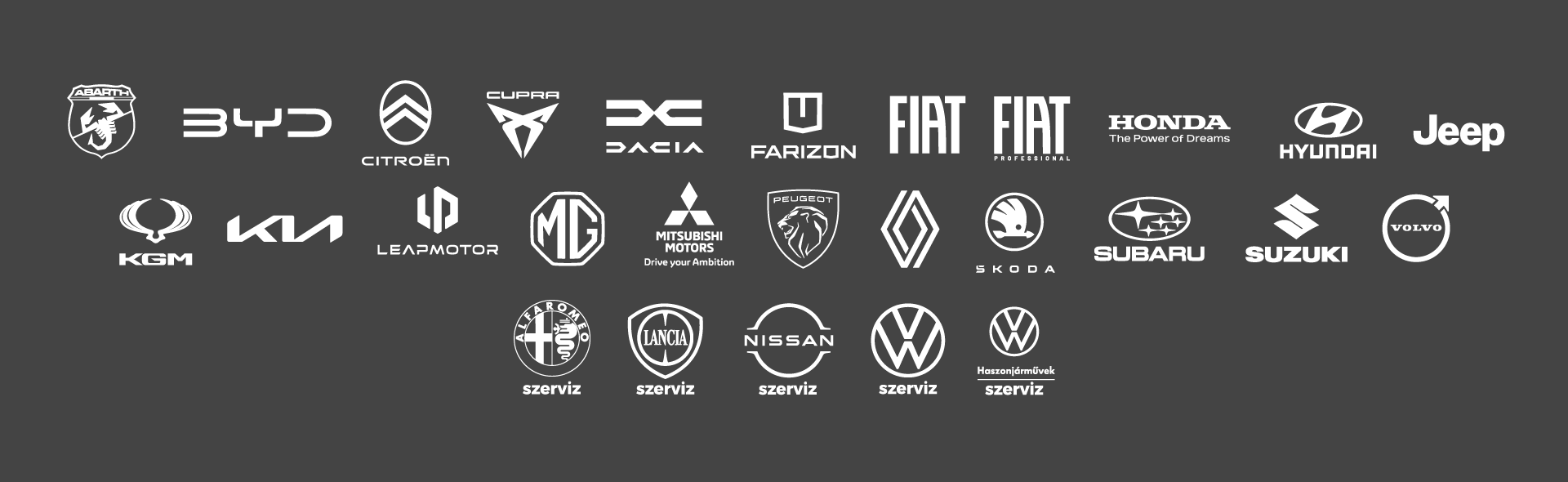 Abarth, BYD, Citroën, CUPRA, Dacia, Farizon, Fiat, Fiat Professional, Honda, Hyundai, Jeep, KGM, Kia, Leapmotor, MG, Mitsubishi, Peugeot, Renault, Škoda, Subaru, Suzuki, Volvo, Alpha Romeo, Lancia, Nissan, Volkswagen