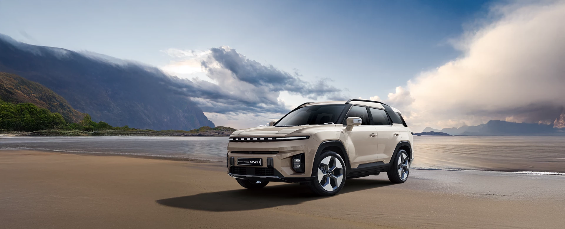 A modern formavilág mellett erőteljes, terepjárókra jellemző stílusjegyek határozzák meg a Torres EVX megjelenését.